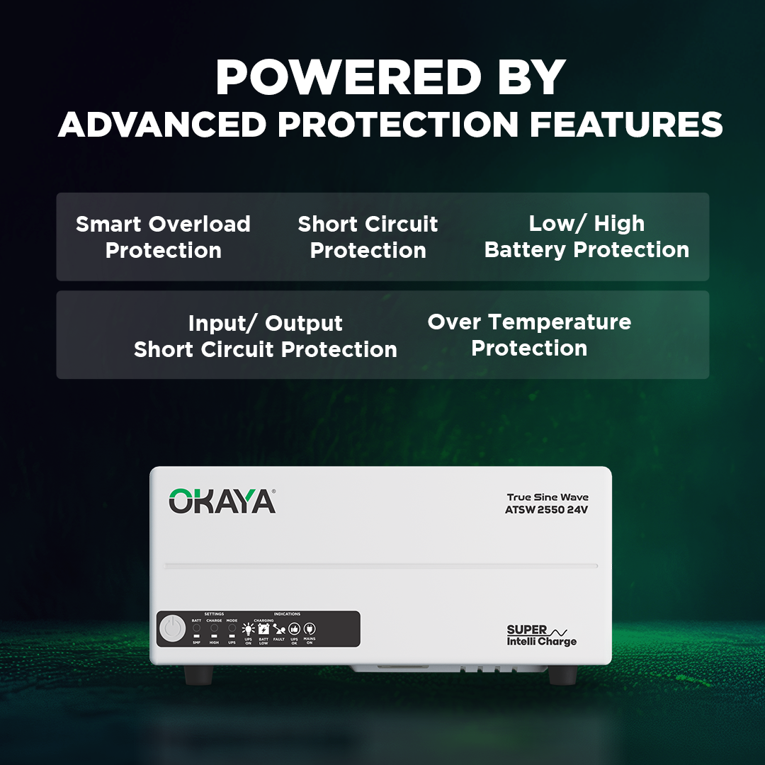 Meet the powerful Okaya ATSW 2550 24V – a 2000 VA Advanced True Sine Wave Home UPS designed to protect and power your appliances with faster charging, smooth switchovers, and energy-efficient operation.