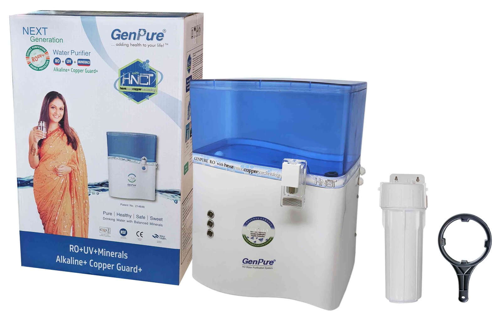 Specifications for domestic system APPLICATION SUITABLE FOR BRACKISH WATER FILTER LIFE APPROX 3000 LITRE / 6 MONTHS FILTERS SEDIMENT, PRECARBON, POST CARBON, ALKALINE, COPPER FLOAT GENPURE FR KFL INLINE SET GENPURE INPUT VOLTAGE 100-300 VOLT AC (50Hz) INSTALLATION COUNTER TOP MAX.OPERATION TDS < 3000 PPM MEMBRANE TYPE THIN FILM COMPOSITE MIN.INLET PRESSURE / TEMP 0.3 kg / cm2, 10 °C MODEL ULTIMA PLUS OPERATING VOLTAGE 24 VOLT (DC) PRODUCT DIMENSION 21.1 (H) x 9.9 (W) x 16.7 (L) PURIFICATION CAPACITY 12 LITRES PER HOUR RECOVERY RATE MORE THAN 30% AT 27°c ± 2°c SMPS ACCORD SOLENOID VALVE SLX STORAGE CAPACITY 10 LITRE TECHNOLOGY RO + UV TOTAL POWER CONSUMPTION 50 W TUBE 1/4" & 3/8" SYSTEM WEIGHT ONLY 8 kg (Approx) UV SYSTEM YES PUMP LP - 75 GPD Country of Origin INDIA PACKING LIST MANUAL, PREFILTER SET WITH SPUN, WRENCH, INTEGRATED INLET VALVE