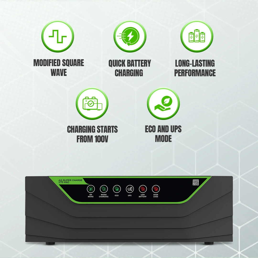 Specifications Model AQ SUPER CHARGE 1775 Range Name (Non Solar) AQ Super Charge VA Rating 1.5kVA Output Waveform Sine Wave Warranty 36 Months Net weight (kg) 13.5kg No. of 12V Batteries in Series 1 Nominal battery bank voltage 12V Rated Voltage 230V AC Product Quantity 1N (One Number) Contents 1 N Inverter, 1 N Warranty card Warranty Details 36 Months (For detailed terms and conditions of warranty please refer to the warranty card supplied along with the product) Country of Origin Made in India Transfer Time <20ms